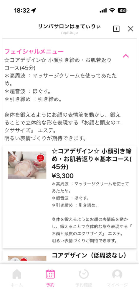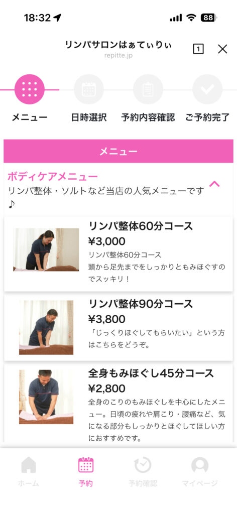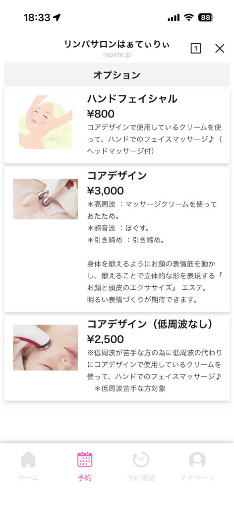 今回、以前使っていた予約サイトではメニューが分かりづらいとの声がありましたので、セットメニュー表示からオプションメニューとして分けて表示していますので、ボディケアメニューとオプションメニューをそれぞれ選択し予約することが可能になりました。